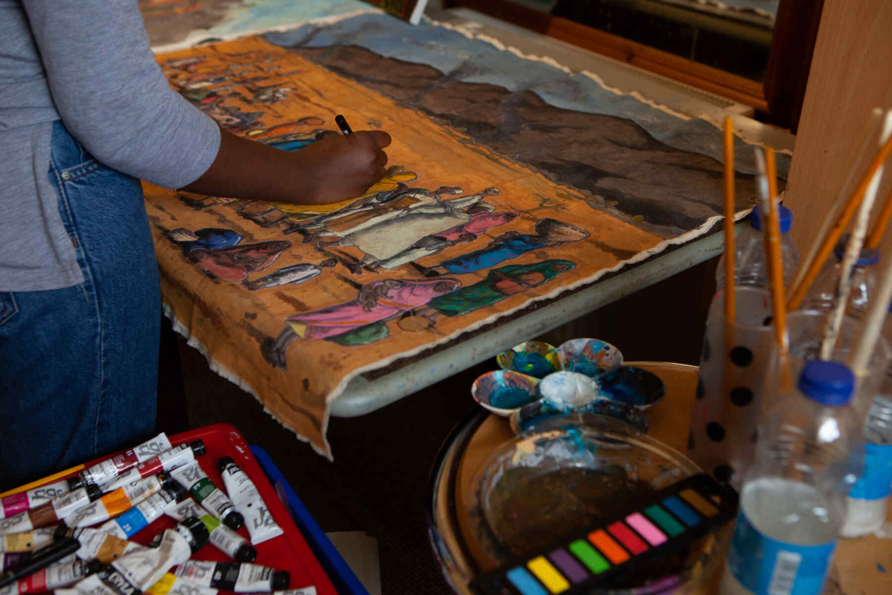 A series of hand-painted images on cloth, displayed on a reconstructed refugee tent by #TheDirars. The art installation recreates one family’s journey from war-torn Darfur in Western Sudan, then conflict in Libya, and four years in a refugee camp, before resettlement in the UK.